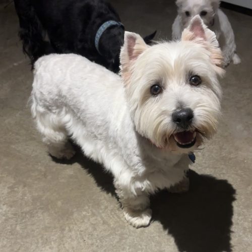 Molly is a perfect Westie! She is friendly, crate trained, potty trained, and loving. She does require a fenced-in yard. She has darted out the front door before in her foster home, so she needs to be in a home where the adopters can keep up with her.