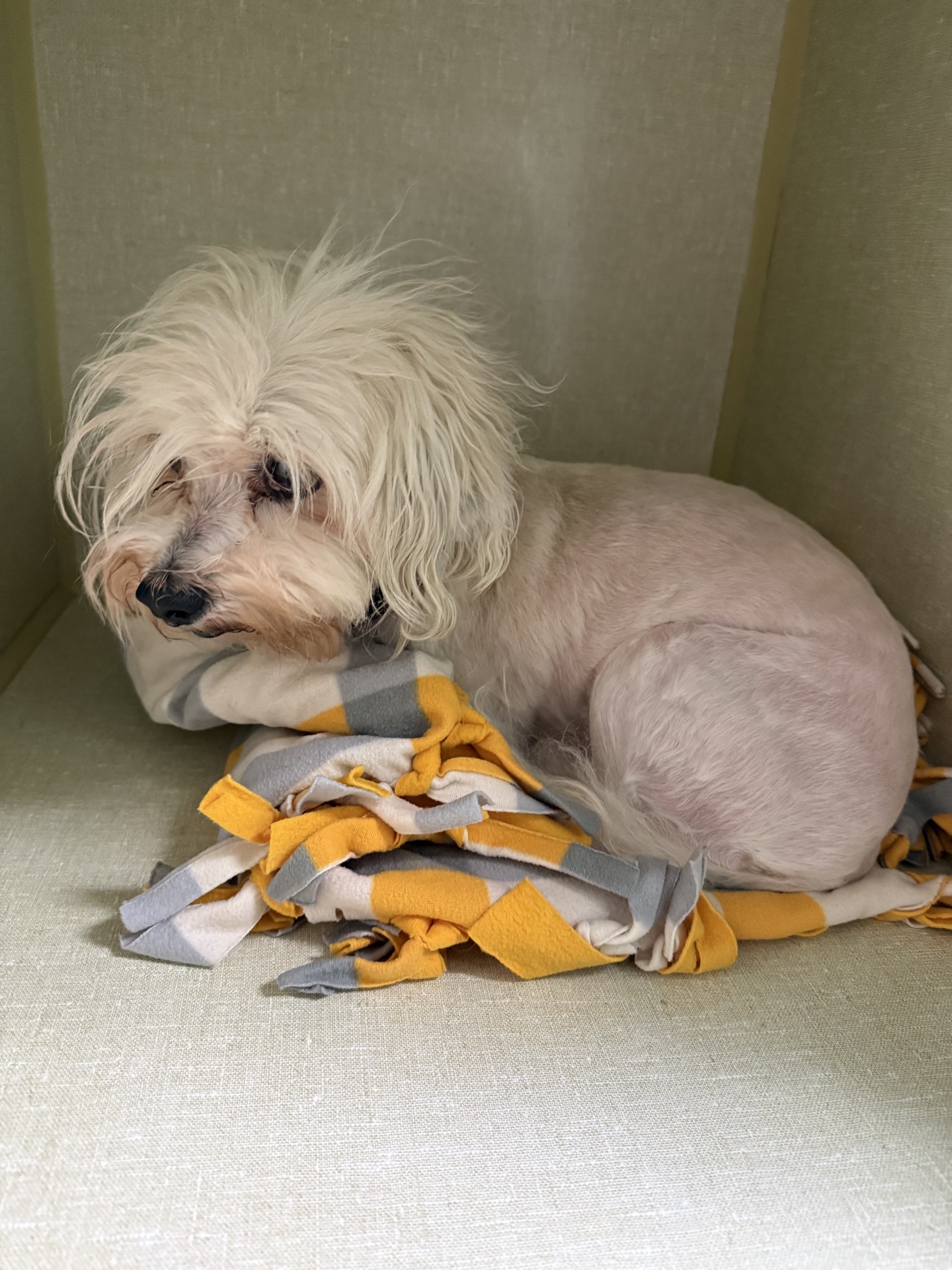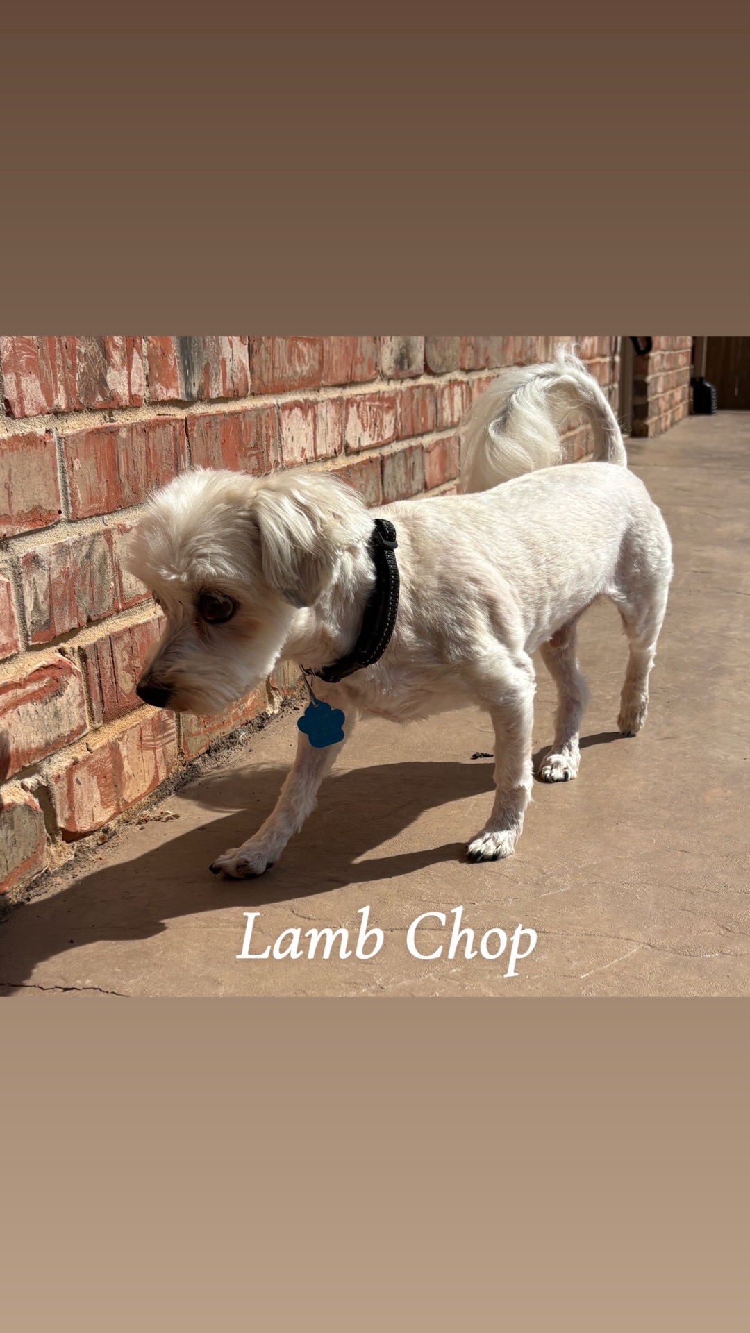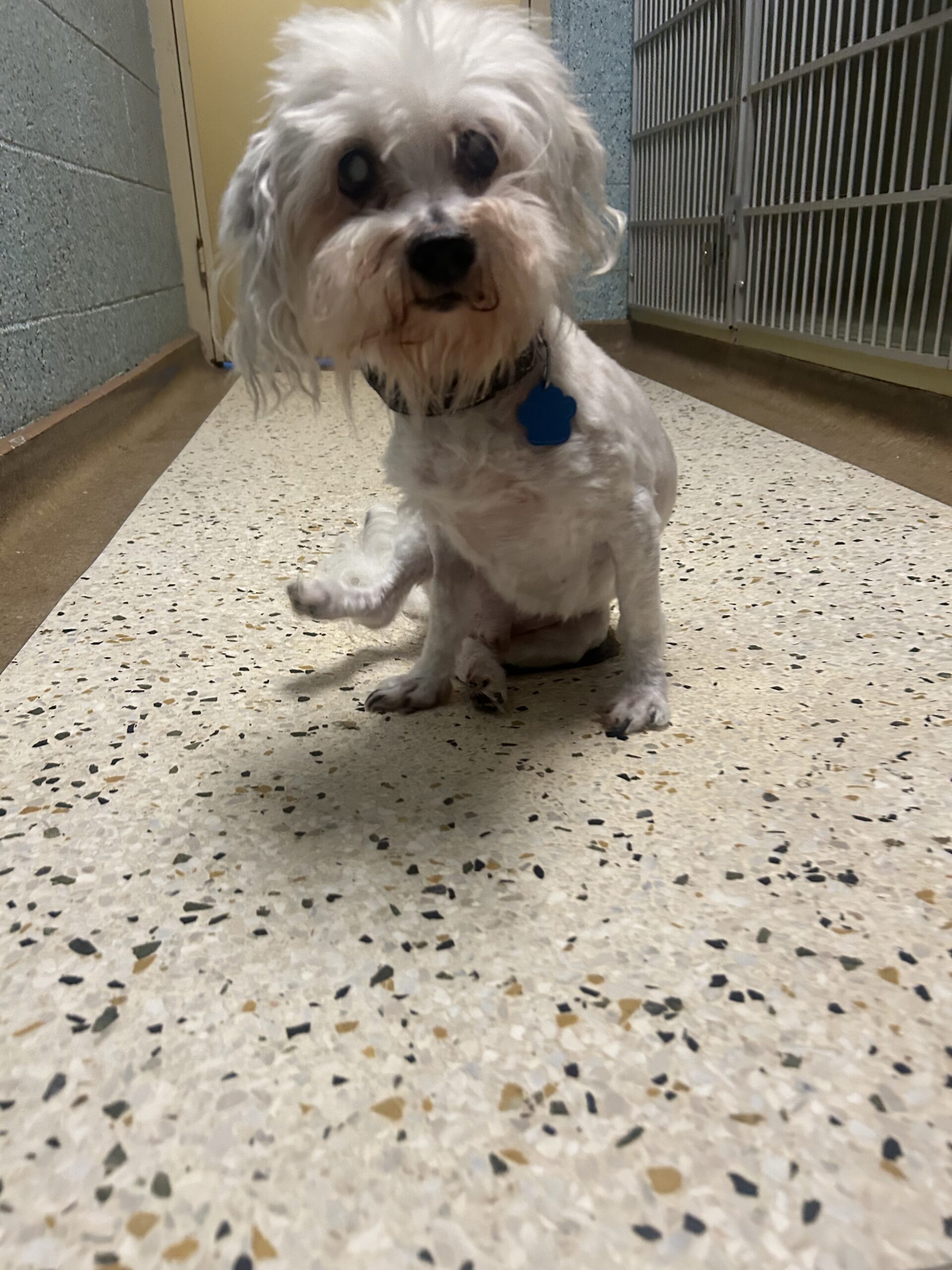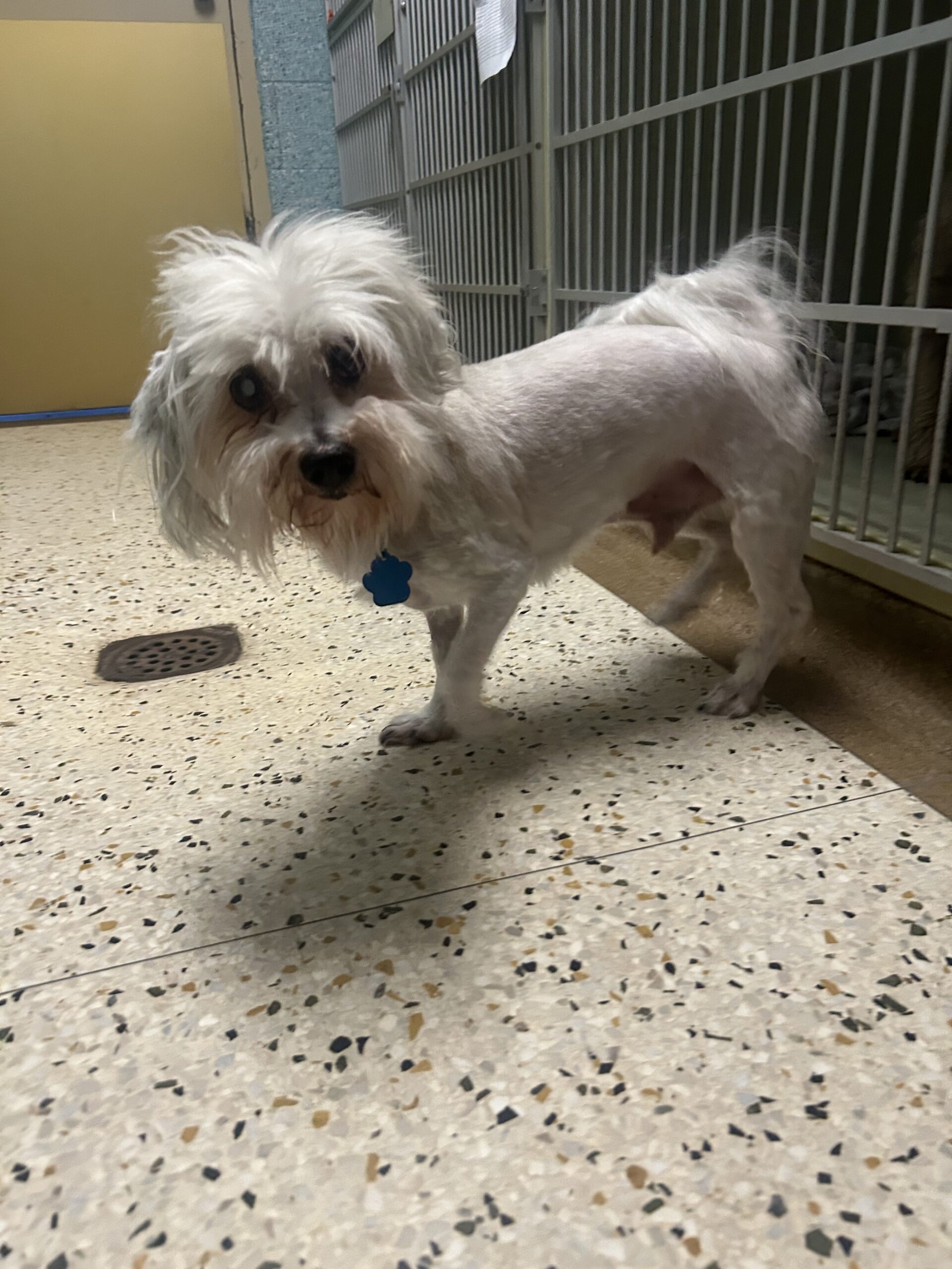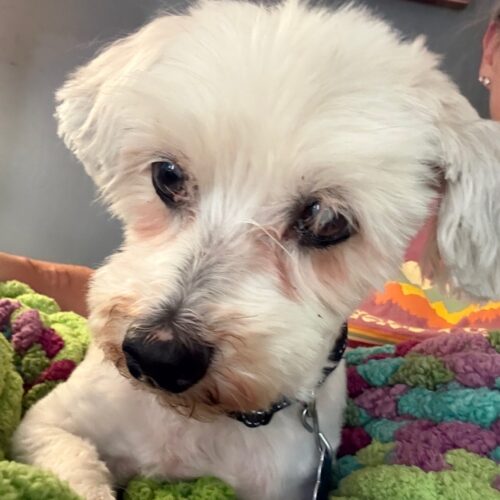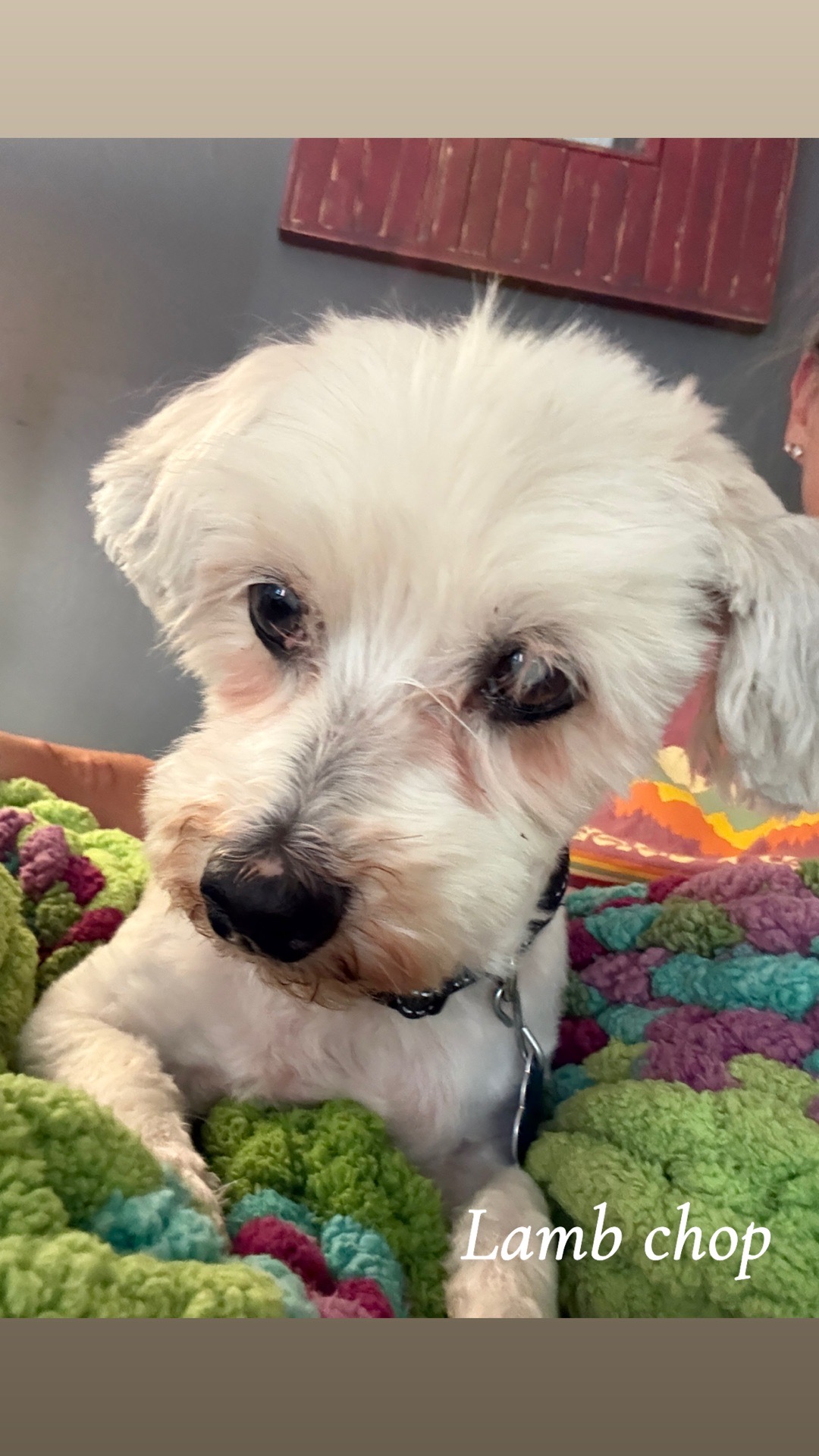 Lamb Chop is a very sweet and calm Maltese mix. He has glaucoma so he will be on eye drops and will have trouble seeing, but Lamp Chop won't let it stop him. This little guy will steal your heart.