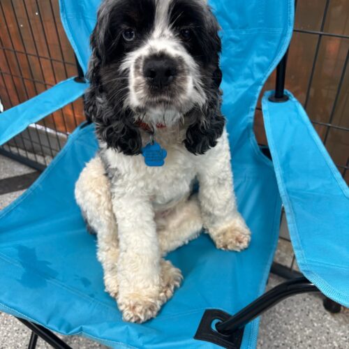 Rumble is a 1 year old Merle colored cocker spaniel who weighs 19 pounds. He’s a young boy who has lots of energy and playfulness in him. Mornings are his typical high energy time when he’s ready to run, wrestle and play. Rumble gets along great with other dogs and enjoys playing with dog toys. He specifically requests Nyla bones and hard rubber toys for chewing, tug of war ropes for playing with his humans, as well as balls and other things to chase.
